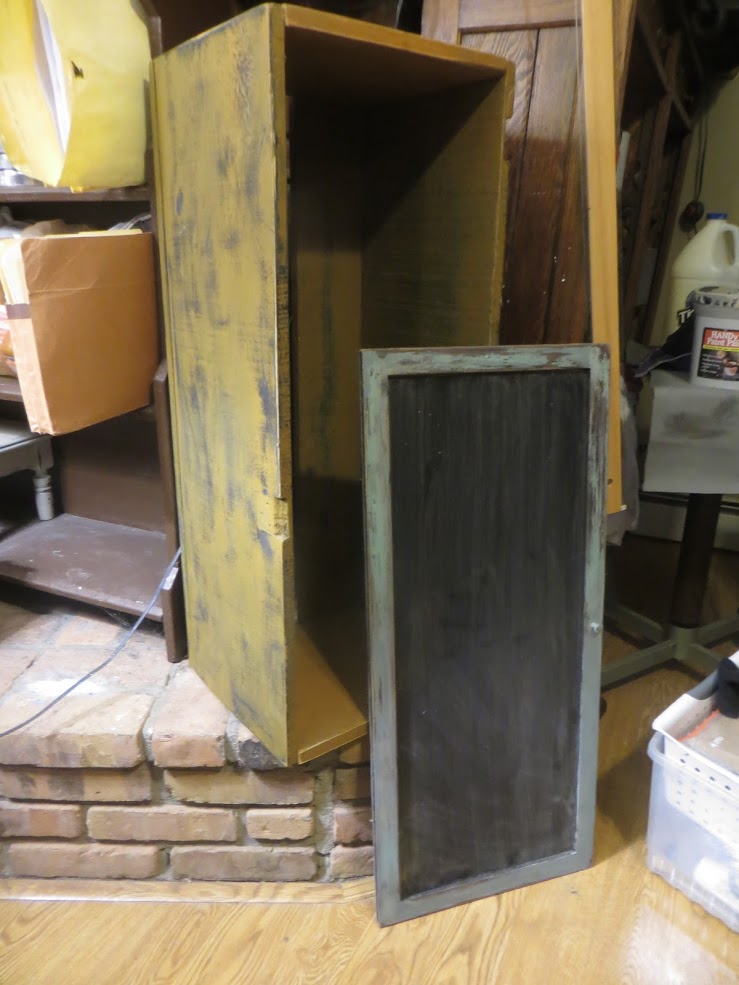 Anyone that has seen my dining room can attest to the fact that it not typical. It is filled with functioning sanders, drills, rolling carts, cans of paint and a compound mitre saw. A few weeks ago, under the guise of "cleaning", an old wood, wood box got stacked next to a slender window I was turning into a chalkboard. Screeeeeeech! A chocolate and peanut butter moment!
